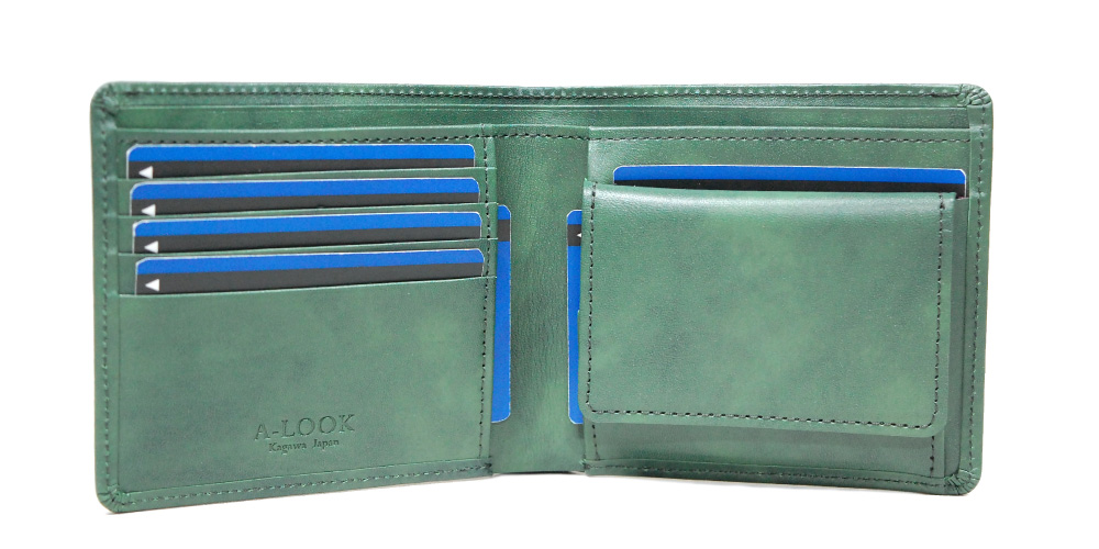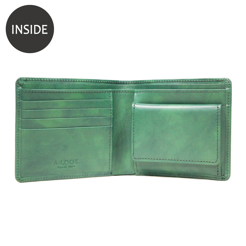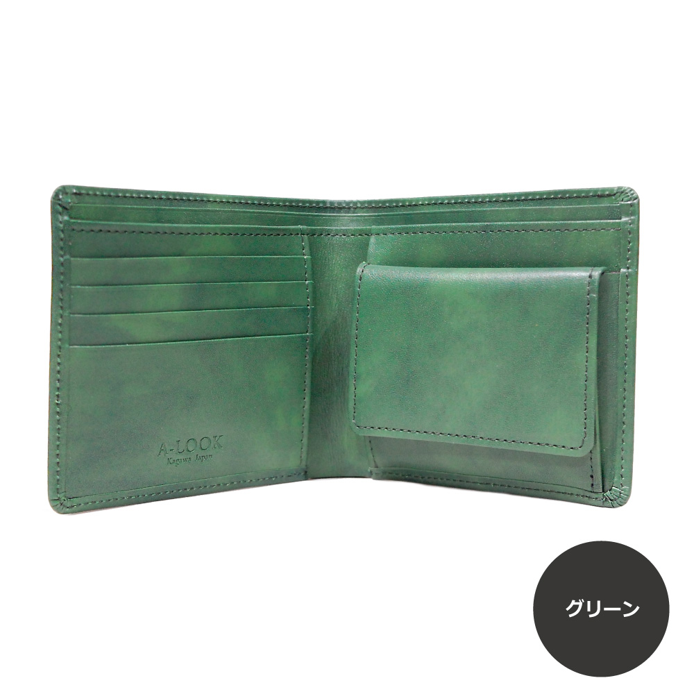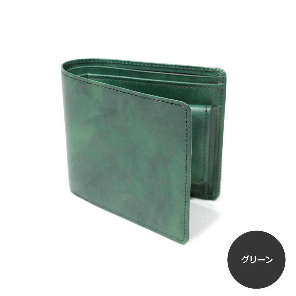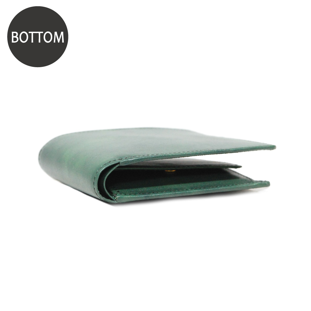 ムラ染めオリーブレザー使用 2つ折りデザインのお財布