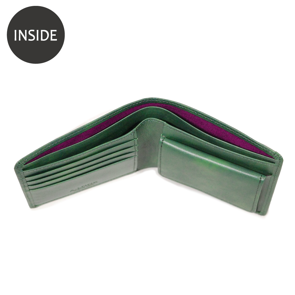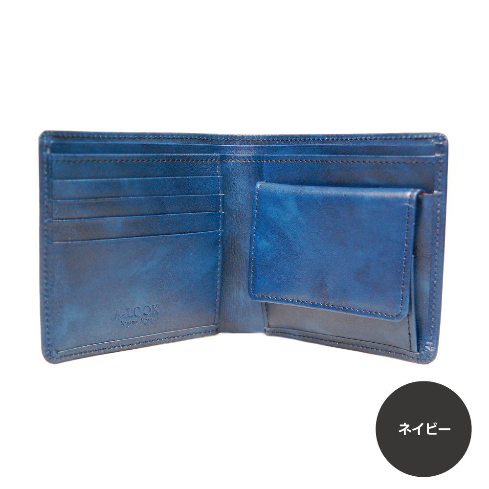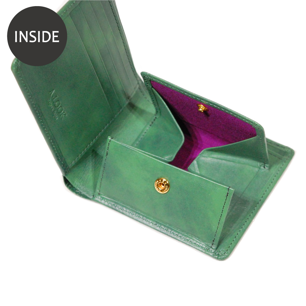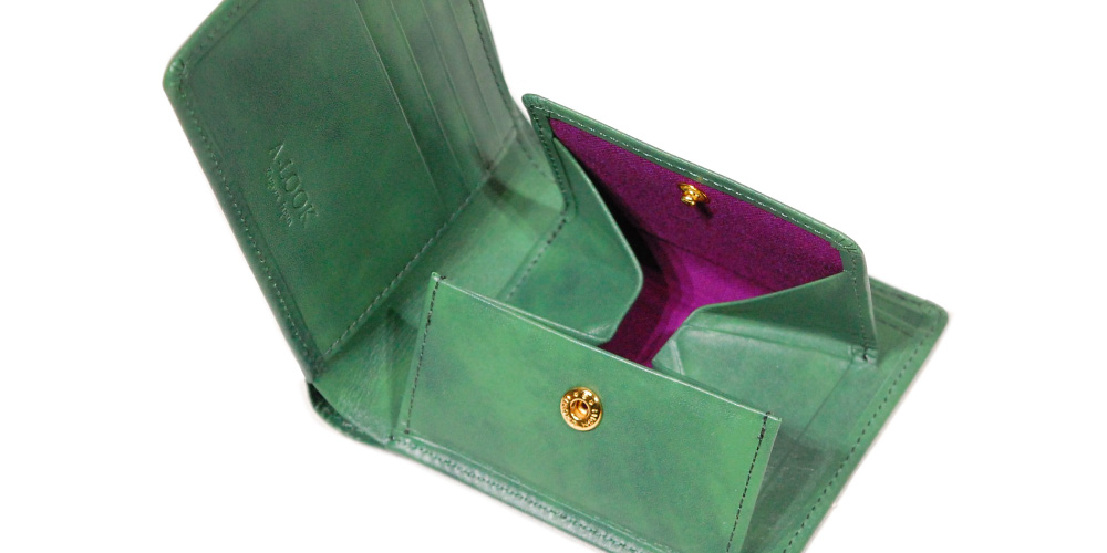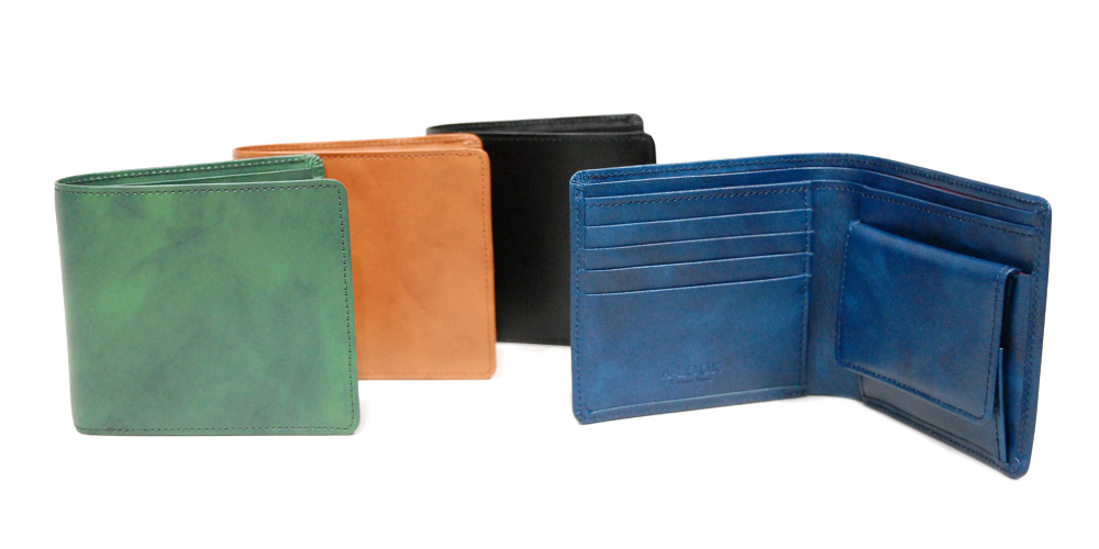 ムラ染めオリーブレザー使用 2つ折りデザインのお財布