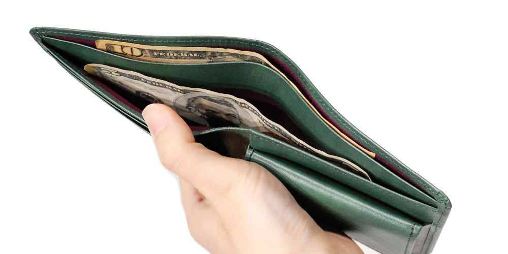 洗練されたシンプルさを備えつつも、使い勝手のよい2つ折りタイプとなっています。コンパクトで薄いデザインながらも、お札入れ2カ所、カードポケットは7カ所備えており、必要なお札やカードをしっかり収納することができます。